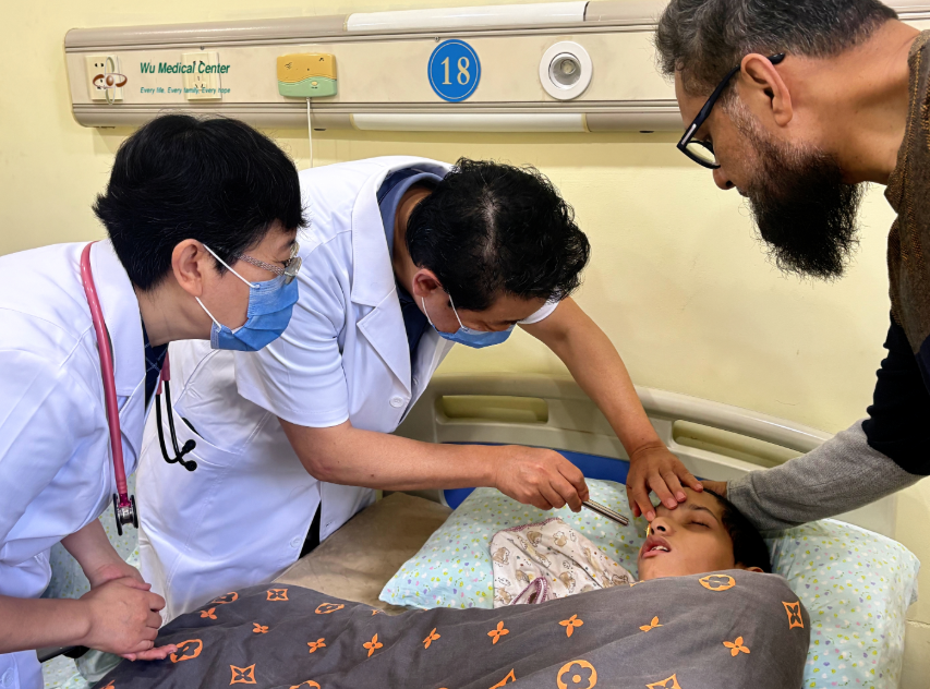 The patient was alert but had poor mental status. He had speech difficulties and was unable to speak. Both eyes showed no light perception, with the right eye exhibiting white cloudy deposits, and there was no pupillary response to light in either eye. His forehead wrinkles were symmetrical, and the nasolabial folds on both sides were deep. He had poor neck support and maintains a chin-down position. He could turn over independently, but his back muscles were weak, and when assisted in standing and walking, he displayed a forward abdominal protrusion and was prone to falling. His hand grip function was poor. There was observable spontaneous movement in all four limbs, with muscle strength rated at grade 4-. The muscle tone in his limbs was generally normal. Bilateral knee reflexes were active, while the Achilles reflex was not elicited. Bilateral Babinski sign was weakly positive. He was unable to cooperate during testing for deep and superficial sensation or coordinated movements.