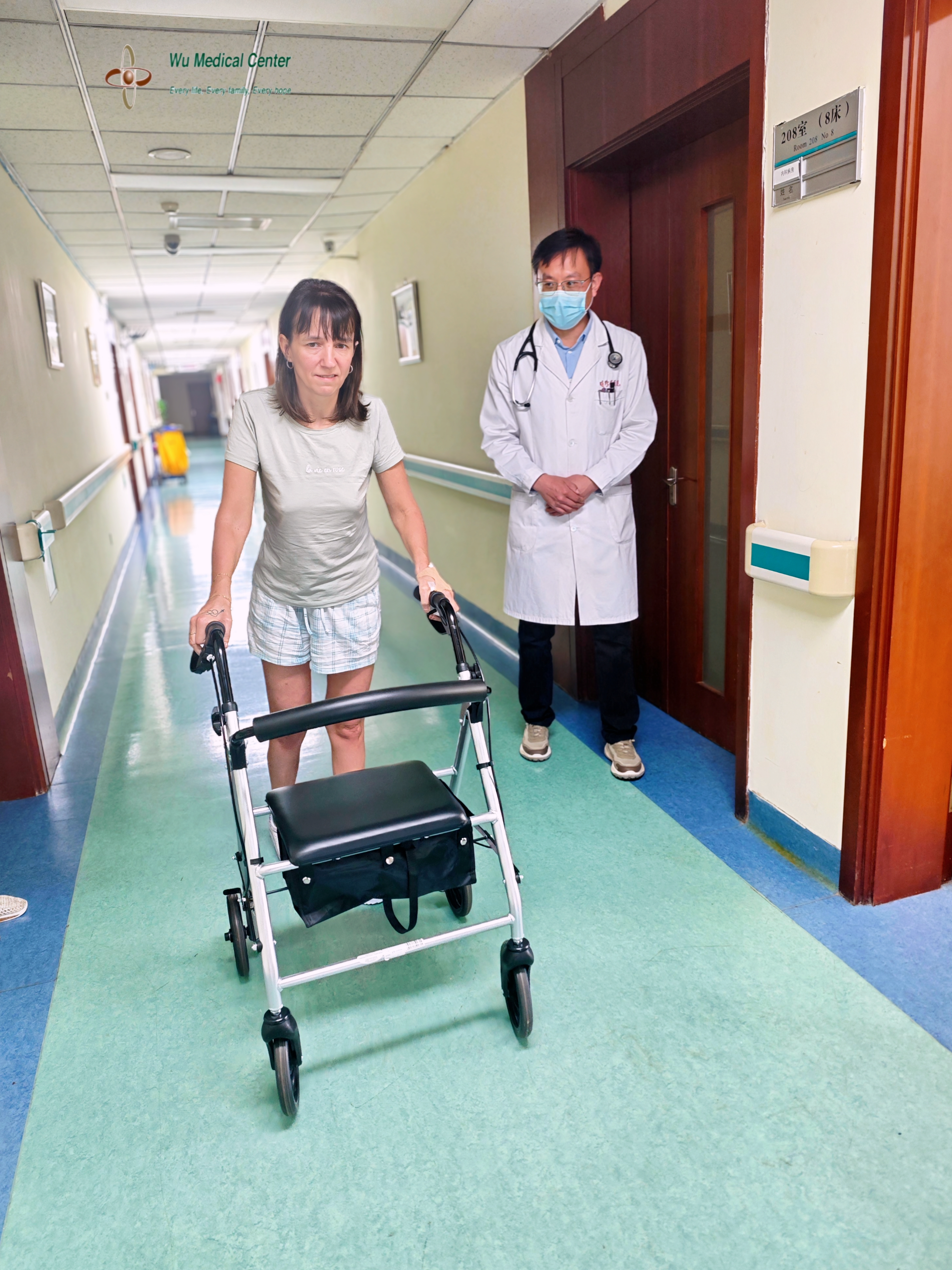 The patient feels that the disease has stopped progressing and her motor function has improved significantly. The muscle strength of her neck rotation and shoulder shrugging is grade 4-. The muscle strength of her upper limbs is improved: the muscle strength of her left upper limb is grade 4, with left hand grip and wrist strength grade 3+; the muscle strength of her right upper limb is grade 4-, with right hand grip and wrist strength grade 3. She can grasp others' fingers with both hands and resist a certain amount of resistance; her arms and wrists can also resist resistance, and lifting her arms is easier and more flexible than before. The flexibility of fine movements of her fingers is significantly improved compared with that upon admission; she can use a mobile phone and complete the writing of some words and characters. Her waist and abdominal muscle strength and lower limb strength are increased to about grade 4; she can stand up from a low sitting position with slight assistance, and her control ability when sitting down from a standing position is improved. She can stand independently for more than five minutes; her walking ability is improved, she can basically walk independently, walk more stably than before, her balance ability is improved, and she can walk a longer distance of more than 50 meters with a walker. Her mental state, physical fitness and endurance all are improved.