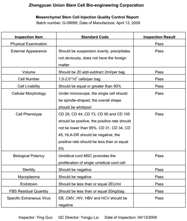 The following QC report is from one of our stem cell providers "Zhongyuan Union Stem Cell Bio-engineering Corporation " which is China's largest stem cell research and manufacturing company (also known as "National Industrial Base of Stem Cell Technology" ) located in