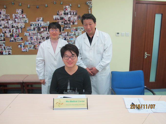 Yoshiharu felt back and waist pain 1 year ago, his left leg had intermittent hypesthesia and it was hard for him to go up and down stairs. His balance function became worse when he was running and he often fell over. He had distal muscular tremble and went to a local hospital where he received an examination of hydrocephalus. The result showed his protein level in CSF was higher than normal, the number of cells was at normal range but his balance function was bad. His condition rapidly became worse and he couldn’t stand or walk by himself. His facial muscles were weak and he was unable to chew or swallow well. It was difficult for him to close his eyes or shut his mouth and he spoke some words unclearly. He went to another hospital where they did lumbar puncture, EMG, and other examinations and he was diagnosed with CIDP. He was injected with gamma globulin 400mg/kg/day for 4 days, but he showed no improvement. The deep vein thrombosis resulted in pulmonary embolism so the doctor prescribed anticoagulant therapy. His respiration function and chest pain improved but his CIDP was still getting worse. Urbason had no positive effect on him. He also did plasma exchange for 6 days without any improvement. He had motor problems in his arms and legs and was unable to stand up or walk. His arms were able to do some simple work but he wanted a better life so he came to our hospital.